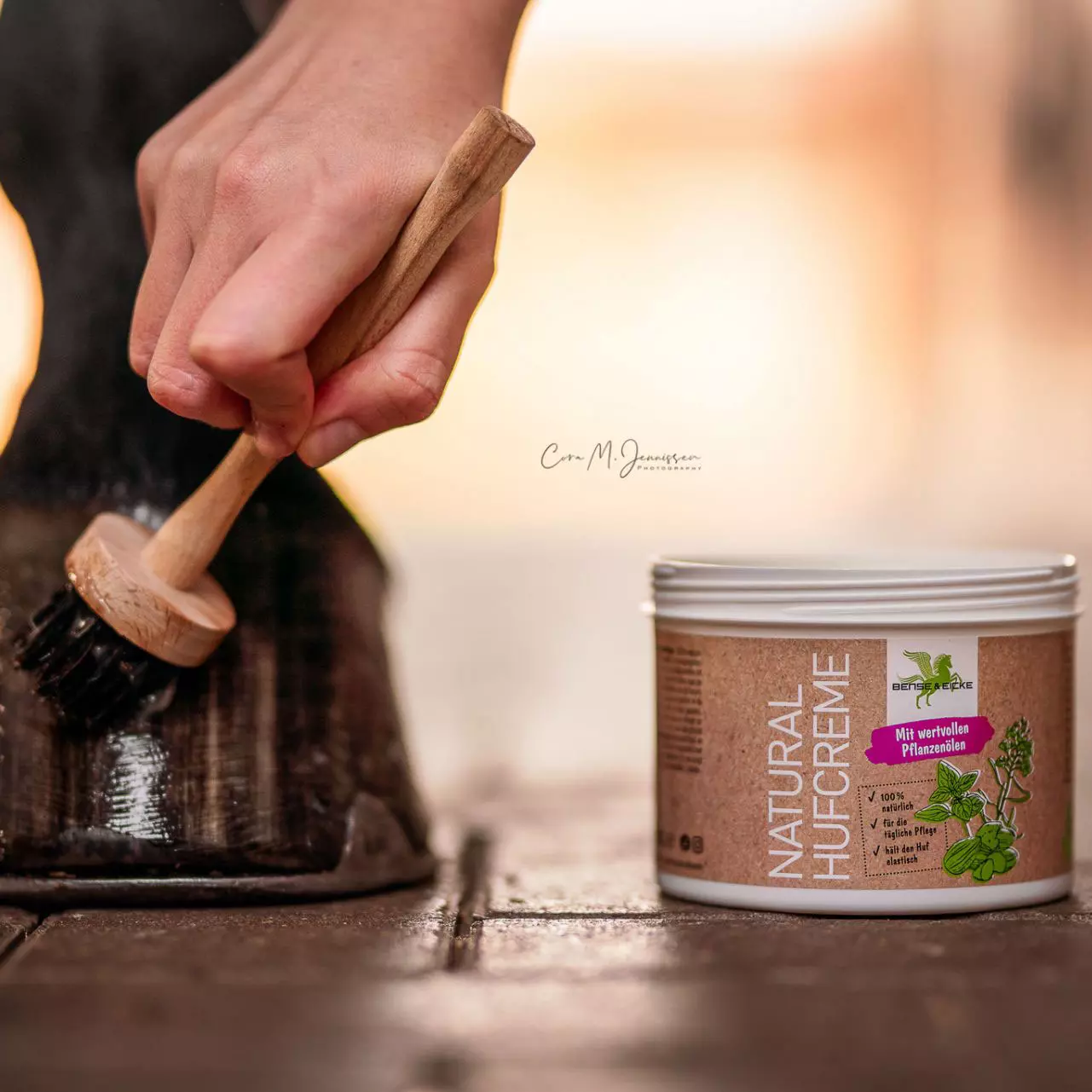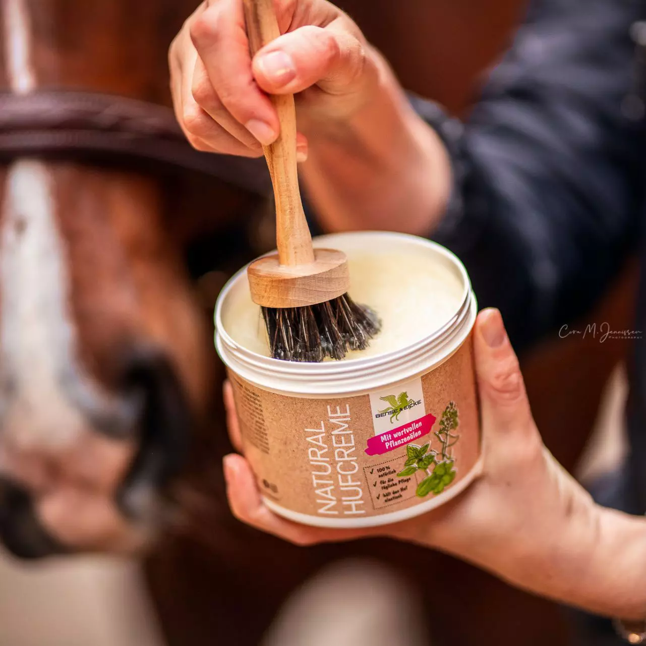 Anwendung: Nach der Hufreinigung mit dem Pinsel auf die äußere Hufwand und den Kronrandbereich auftragen. Die tägliche Anwendung bringt Schutz und Pflege für den Huf.