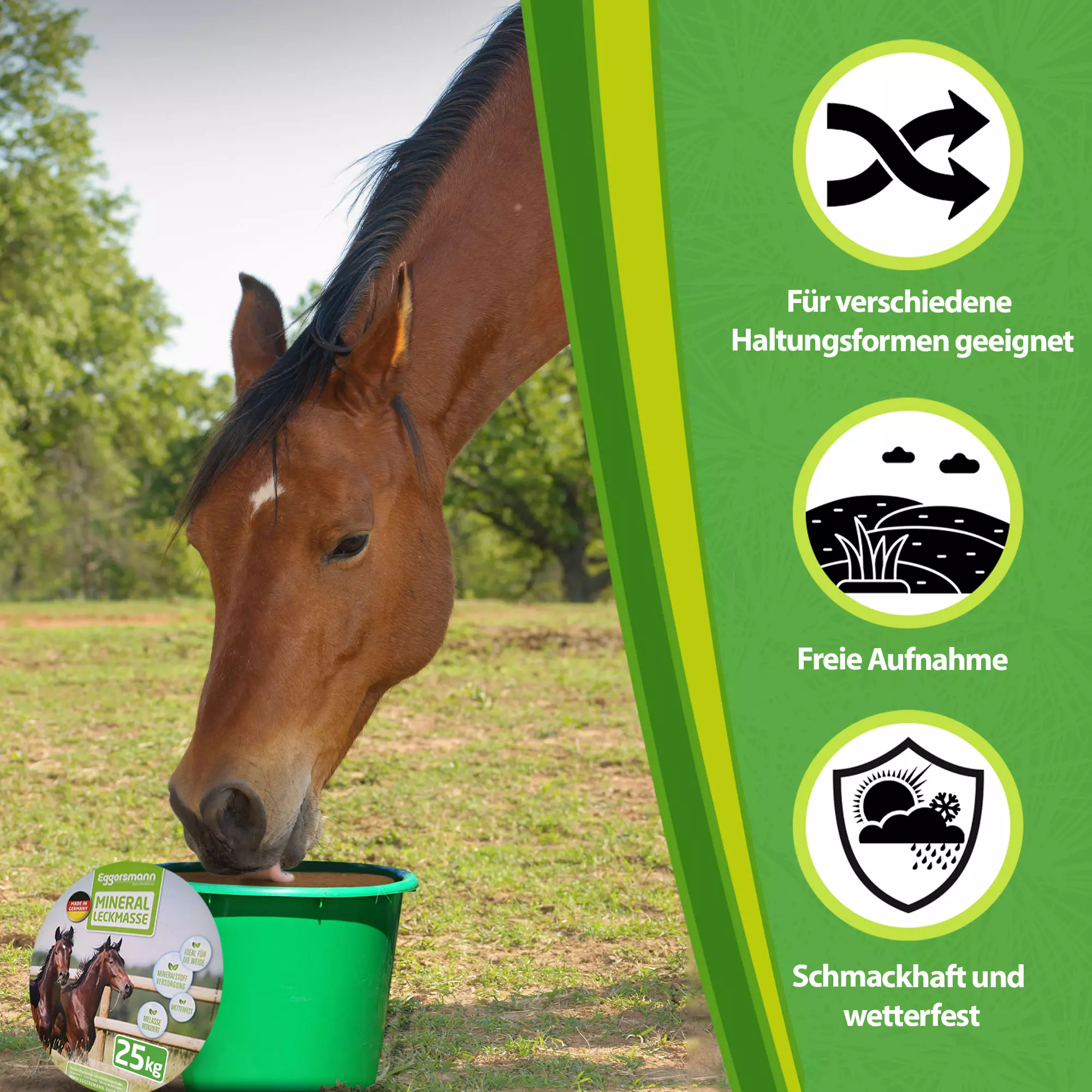Speziell für Pferde und Ponys in Gruppenhaltung oder wenn eine tägliche Krippenfütterung nicht möglich ist, wurde die Eggersmann Mineral Leckmasse konzipiert. Die enthaltenen Mineralstoffe sichern die tägliche Mineralversorgung für den Erhaltungsbedarf von Pferden und Ponys. Der moderate Melassegehalt macht die Mineral Leckmasse sehr schmackhaft, aber verhindert gleichzeitig eine unverhältnismäßig hohe Aufnahme. So können sich Pferde und Ponys in Offenstall, Laufstall, Aktivstall oder auf der Weide das nehmen, was sie brauchen.