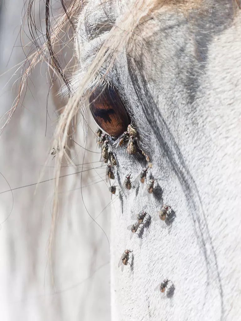 Am Kopf um die Nüstern und an den Augen sind die Fliegen sehr störend für die Pferde. Sie können Krankheitsüberträger z.B. von Augenwürmern sein oder gerade an offenen Wunden zu Entzündungen und Wundinfektionen führen.