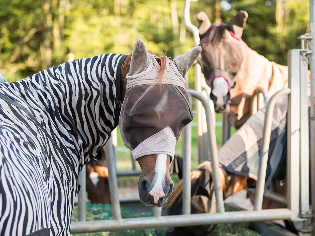 Ähnlich einem Schutzpanzer funktionieren Fliegendecken und Fliegenmasken für Pferde, wie z.B. die Fliegenschutzmaske FinoStretch oder Fliegendecke RugBe von Covalliero. Die Produkte sind so konzipiert, dass das Pferd in seinen Bewegungen und in seiner Sicht nicht eingeschränkt ist. Aufgrund elastischer Materialien ist für einen angenehmen Tragekomfort gesorgt. Darüber hinaus nutzt die Fliegendecke in Zebraoptik das Sehvermögen der Insekten, um diese durch einen natürlichen Effekt fernzuhalten, denn der abwechselnde Hell- Dunkelkontrast des Zebra-Musters wirkt auf Bremsen wenig attraktiv. Lange Fliegenhauben sind laut LPO bei Turnieren nicht zugelassen, weshalb während der Turnierdauer auf die kurze Variante, den sogenannten "Fliegenohren" zurückgegriffen werden muss.