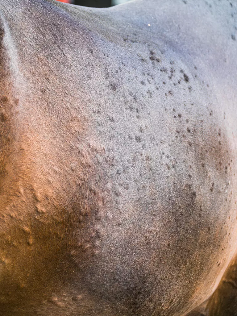 Gebissen werden unsere Pferde vor allem an schwach behaarten Körperstellen wie Ohrmuschel, Nase und Maul, Bauchnaht sowie rund um Euter und Schlauch.