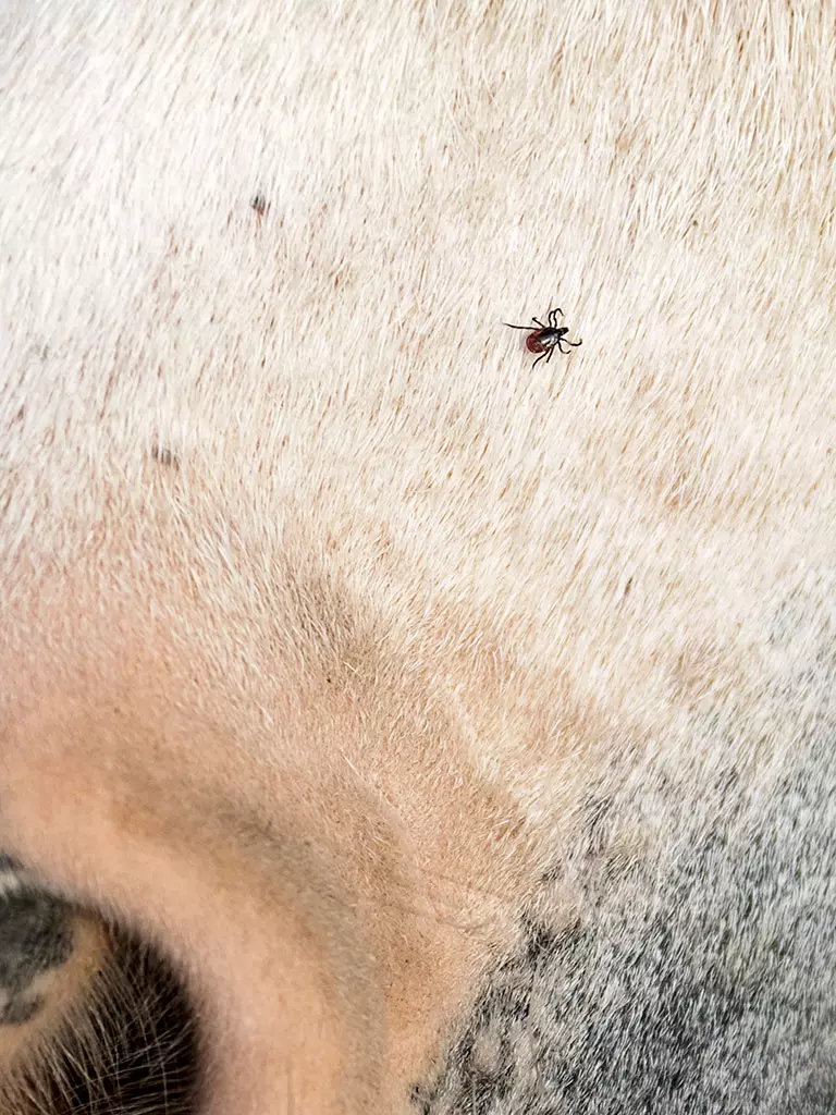 Äußerlich angewendet, können spezielle Hautsprays auf Basis von fermentierten Pflanzenauszügen (z.B. EMH Derma Liquid) das Milieu der Haut positiv beeinflussen, wodurch die z.B. für Zecken so anziehenden Stoffe wie Ammoniak gebunden werden und das Pferd wird weniger attraktiv für die kleinen Spinnentiere.