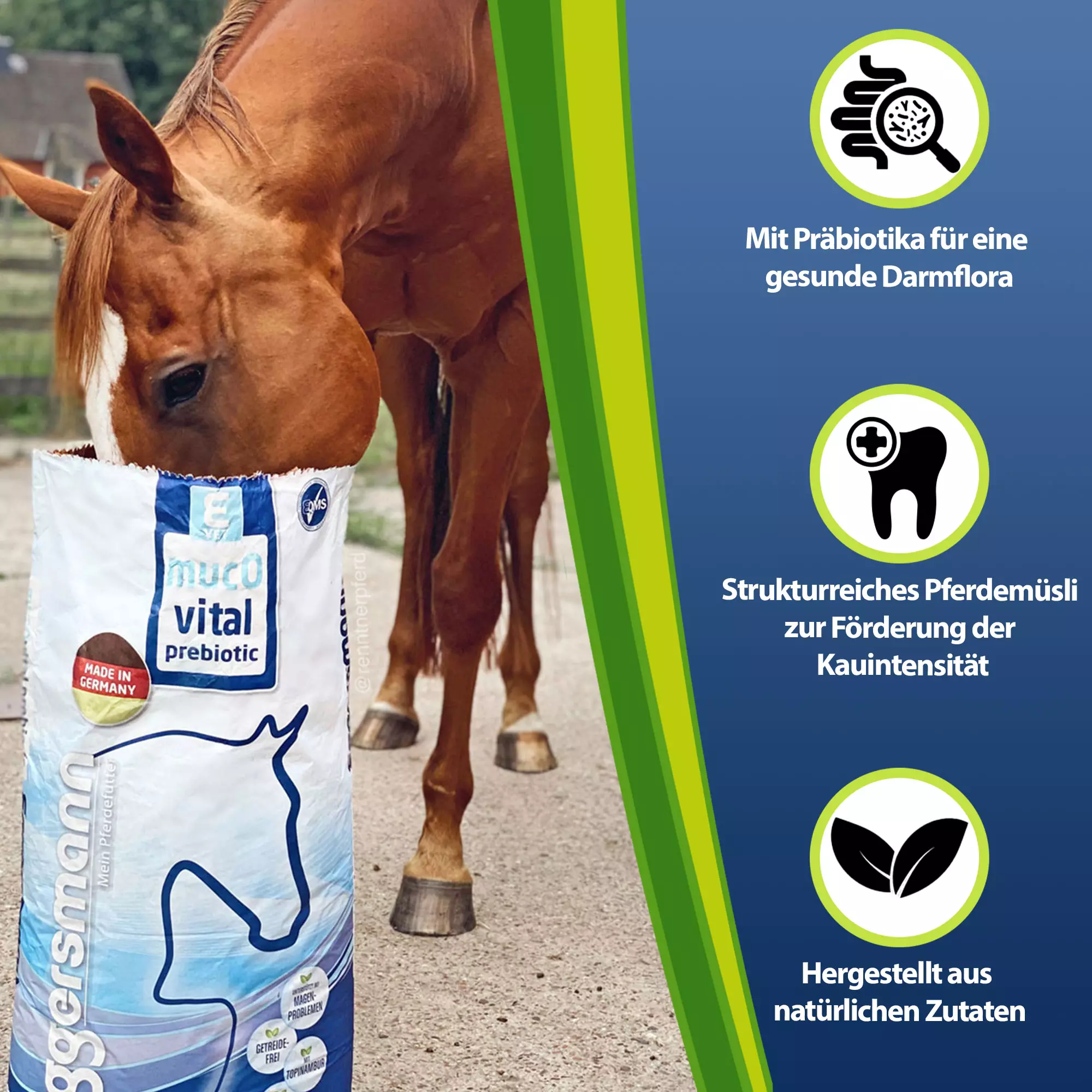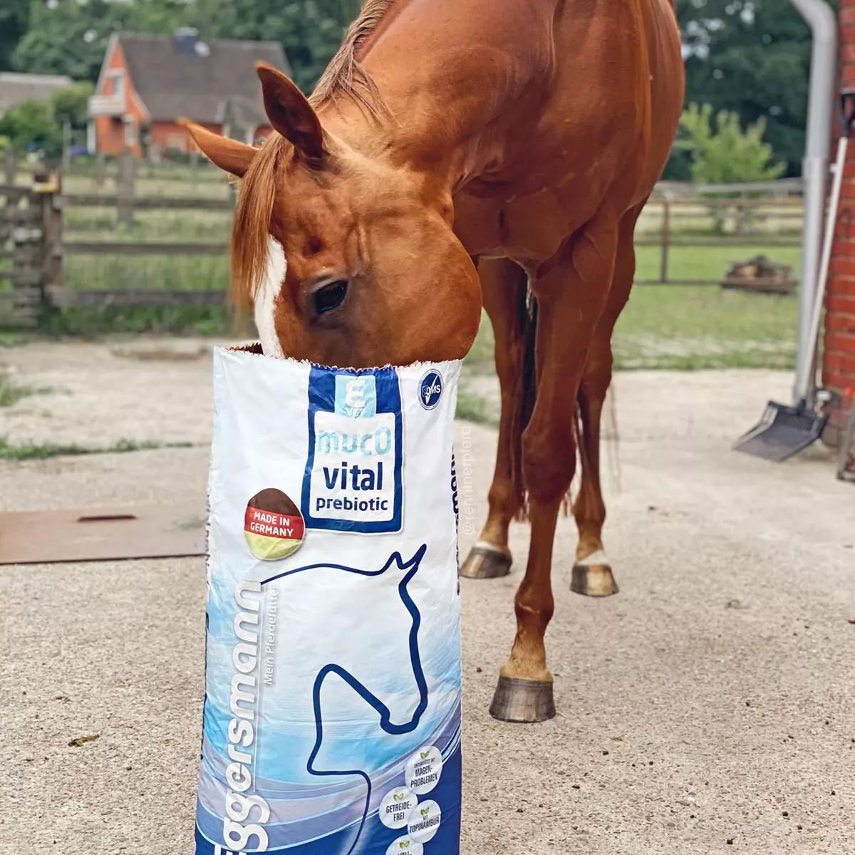 E-VET mucOvital prebiotic ist ein getreidefreies Spezialfutter, das eigens für magenempfindliche Pferde entwickelt wurde. Es ist gleichzeitig ein vollwertiges Kraftfutter, das durch seine einzigartige Kombination aus pflanzlichen Funktionsstoffen für eine Regeneration der entzündeten Magenschleimhaut sorgen kann. Eggersmann E-VET mucOvital kann helfen überschüssige Magensäure zu neutralisieren und durch die hohe Speichelbildung für ein optimales Säure-Basen-Verhältnis sorgen. Die enthaltenen Präbiotika können die Darmflora des Pferdes schonend revitalisieren. Im Sinne der evolutionären Entwicklung des Pferdes enthält das Futter ausschließlich natürliche Zutaten, die einer naturkonformen Ernährung des Pferdes gerecht werden. Es ist reich an leicht verdaulichen Rohfasern und Pflanzenölen und punktet mit einem sehr niedrigen Zucker- und Stärkegehalt.