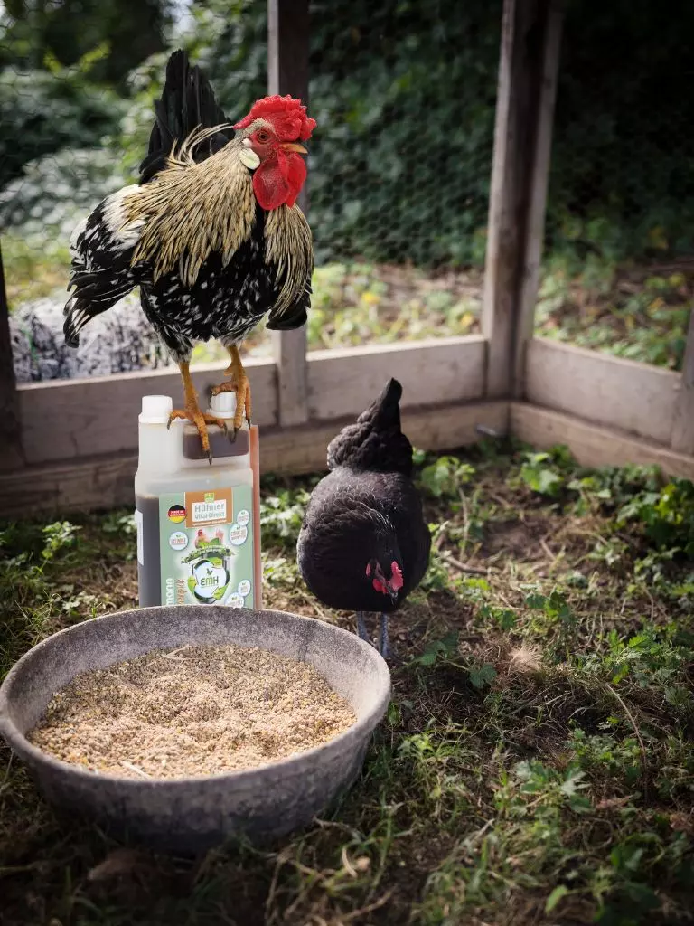 Zur Stärkung der Vitalität und Förderung der Stresstoleranz, kann man den Hühnern sehr gut über eine Darmflorastärkende Kur helfen, die Mauser bzw. die kalte Jahreszeit besser durchzumachen. Bewährt haben sich dafür spezielle fermentierte Pflanzenextrakte wie das Körnerpick EMH Hühner Vital Direkt. Die durch natürliche Mikroorganismen fermentierten Kräuter unterstützen eine ausbalancierte Darmflora und fördern dadurch gleichzeitig eine verbesserte Nährstoffaufnahme.