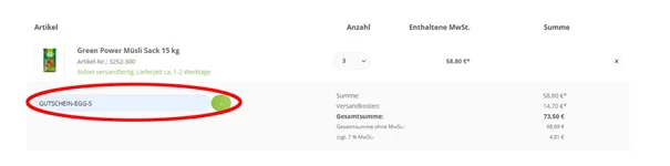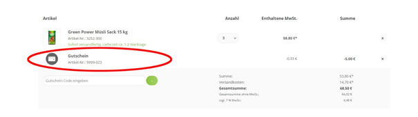 5. Bei erfolgreicher Aktivierung erscheint der Gutschein unter den bestellten Artikeln und der Gutschein-Betrag wird entsprechend Ihrer Bestellung mit der Gesamtsumme verrechnet.