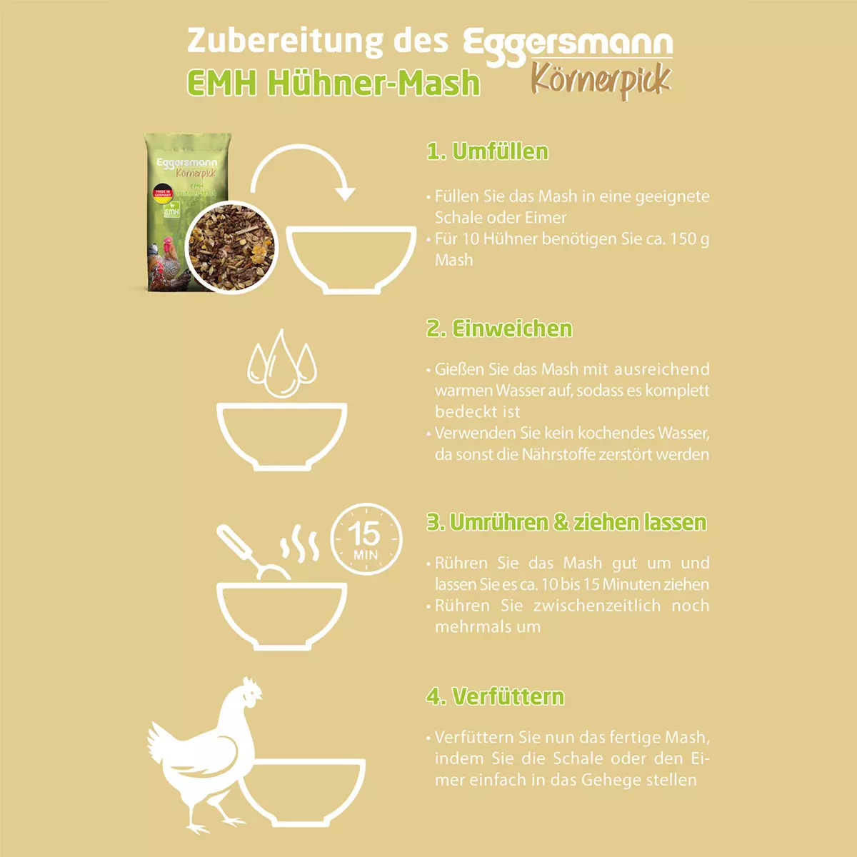 Die Ernährung ist wie bei allen Tieren entscheidend für das Wohlergehen der Hühner. Aus diesem Grund sollte für abwechslungsreiches und ausgewogenes Futter gesorgt werden. Unser EMH Hühner-Mash ist ein innovatives Ergänzungsfutter, das durch seine hohe Qualität eine ausgezeichnete Futterakzeptanz garantiert. Dadurch ist es auch für schlecht fressende Hühner bestens geeignet ist. Es wird eingeweicht verfüttert, ist besonders schmackhaft und bietet eine gern gefressene Abwechslung im Futtertrog. Durch den Zusatz von unseren Eggersmann Mikro-Herbs, einen durch Mikroorganismen fermentierten Pflanzenauszug, kann das Mash die Verdauung Ihrer Hühner unterstützen, gerade wenn diese nicht im Freien gehalten werden können. Unser EMH Hühner-Mash ist auch zur Fütterung von Geflügel wie Gänsen und Enten geeignet.