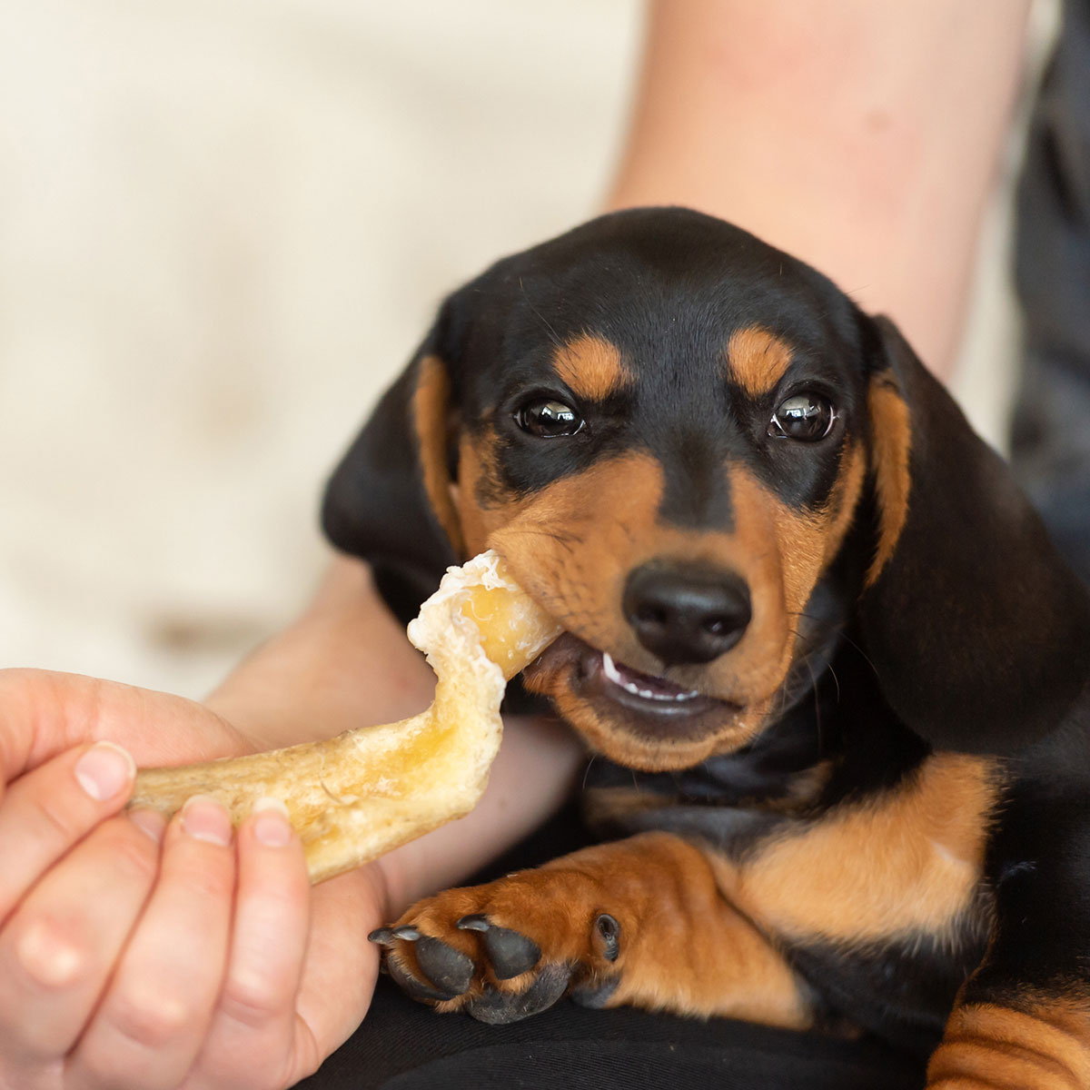 Zusätzlich sollte immer ausreichend Trinkwasser zur Verfügung stehen und der Kausnack unter Aufsicht gefüttert werden, um das Abschlucken zu großer Stücke zu verhindern.
