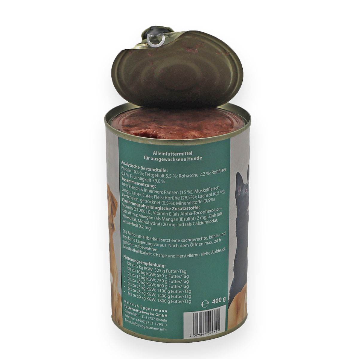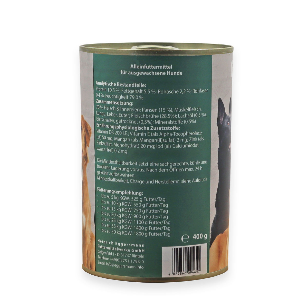 Unser Eggersmann Carnebello mit reichlich Pansen ist ein hochwertiges Nassfutter mit einer besonders schmackhaften Konsistenz, da es saftiges Muskelfleisch mit einer festen Fleischstruktur enthält. Der hohe Anteil an erstklassigem Pansen kann sich, durch die von Natur aus enthaltenen Milchsäurebakterien, positiv auf die Verdauung Ihres Hundes auswirken und den Aufbau einer intakten Darmflora unterstützen. Durch die Kombination mit Lachsöl und wertvollen Omega-3-Fettsäuren wird Ihr Hund mit allen notwendigen Nährstoffen versorgt. Denn durch die besonders schonende Garung sind noch alle wichtigen Vitamine, Spurenelemente sowie Mineralstoffe im verzehrfertigen Futter enthalten. Durch den kompletten Verzicht auf Getreide, Zucker, wie auch künstliche Farb- und Geschmacksstoffe bieten Sie Ihrem Hund mit unserem Nassfutter eine nicht nur köstliche, sondern auch gesunde Mahlzeit. Unser Eggersmann Carnebello mit reichlich Pansen ist als Alleinfutter für ausgewachsene Hunde geeignet, kann aber auch beliebig mit Trockennahrung kombiniert werden.