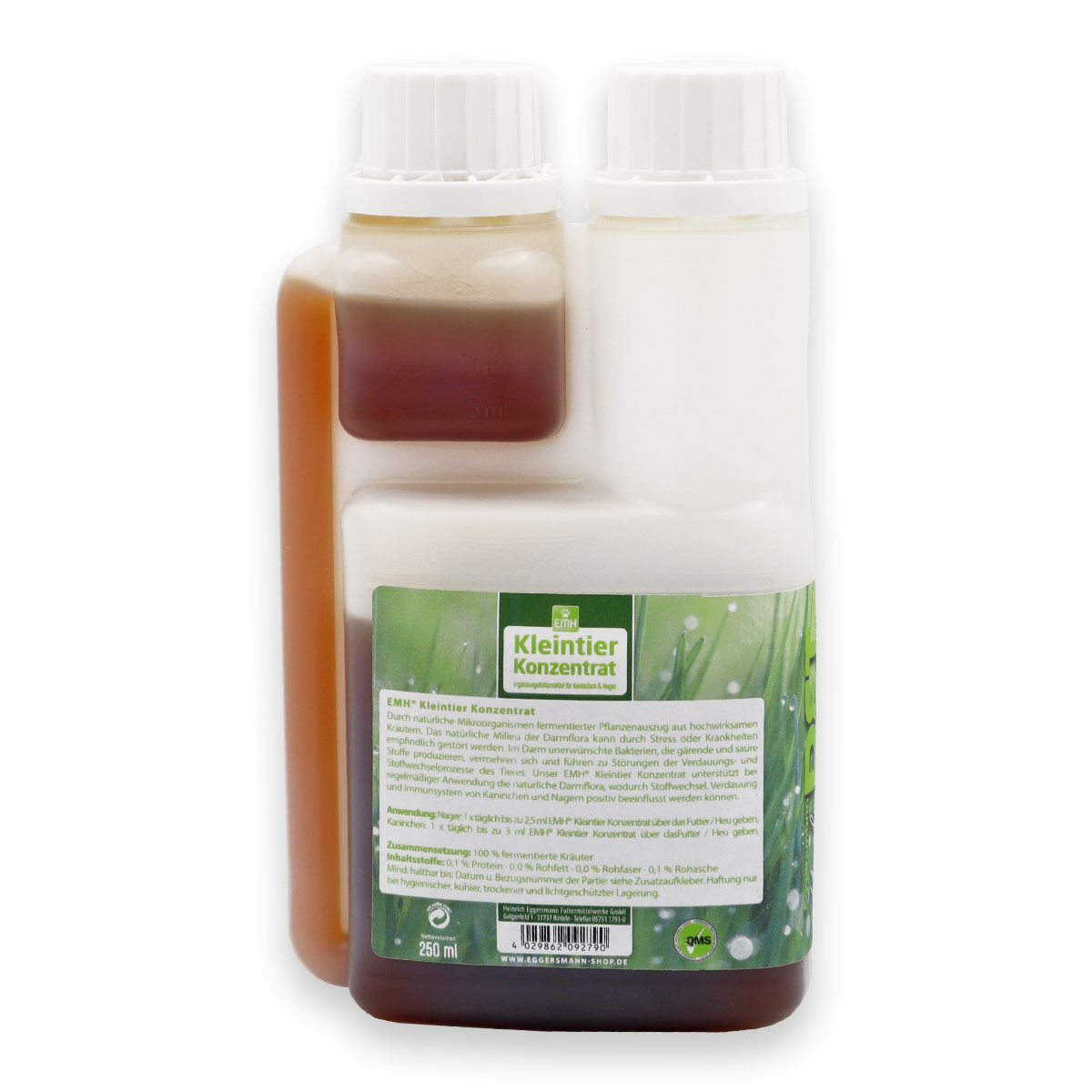 Unser EMH Konzept steht für Eggersmann MikroHerbs. Das sind auf die Tiere abgestimmte Pflanzenauszüge, die durch natürliche und pflanzeneigene Mikroorganismen fermentiert wurden. Durch den regelmäßigen Einsatz von unserem EMH Kleintierkonzentrat können die Stoffwechselvorgänge bei Kaninchen, Hamster und Meerschwein auf natürliche Weise unterstützt und in Balance gebracht werden. Eine stabile Darmflora kann gefördert und so das Immunsystem gestärkt werden. Durch die flüssige Form wird das Konzentrat leicht unter das Futter Ihres Nager gemischt. So kann die Bioverfügbarkeit der zugeführten Nähr- und Vitalstoffe verbessert und der Stoffwechsel gestärkt werden.