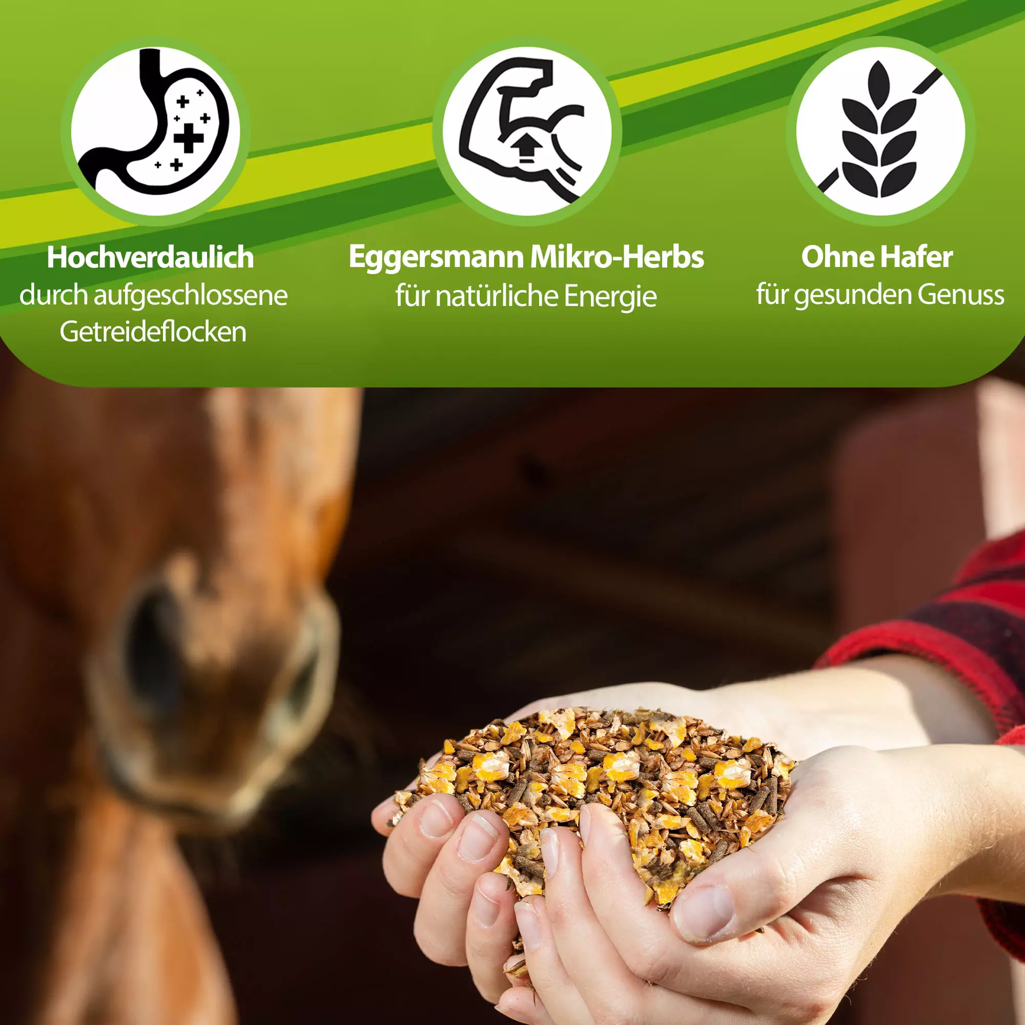 EMH F-Müsli mit hydrothermisch aufgeschlossenen Getreideflocken ist das vollwertige Alleinkraftfutter zu Heu und Stroh.