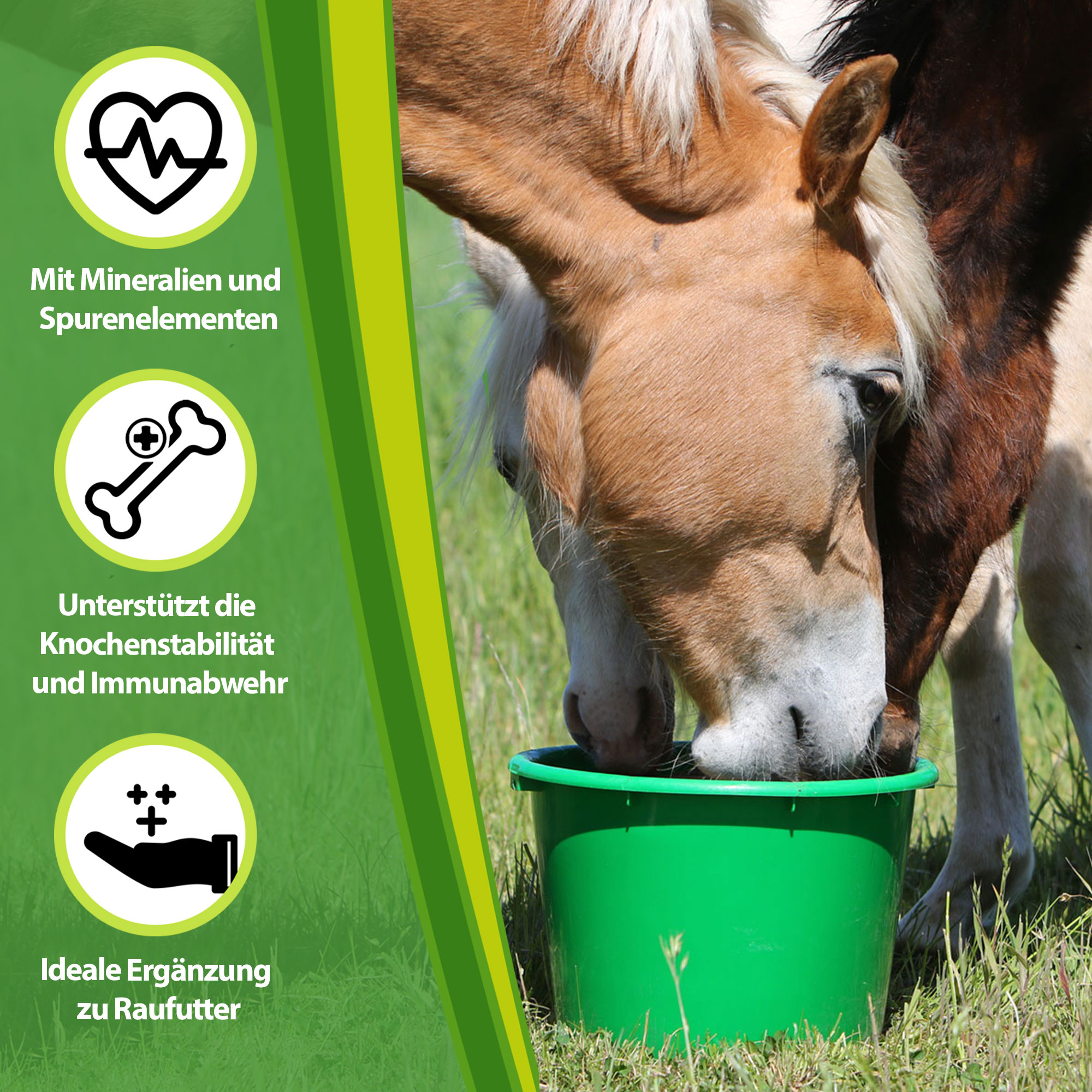 Mineralien wie Calcium, Phosphor und Natrium aber auch Spurenelemente wie Zink, Kupfer und Selen sind wichtige Nährstoffe für die Knochenstabilität und zur Aufrechterhaltung verschiedener Prozesse wie Stoffwechsel und Immunabwehr. Da die Nährstoffgehalte in Heu und Weidegras sehr stark schwanken und viele Mengen- und Spurenelemente über die reine Heu-/Weidefütterung nicht bedarfsdeckend aufgenommen werden, entsteht hier schnell eine Versorgungslücke.