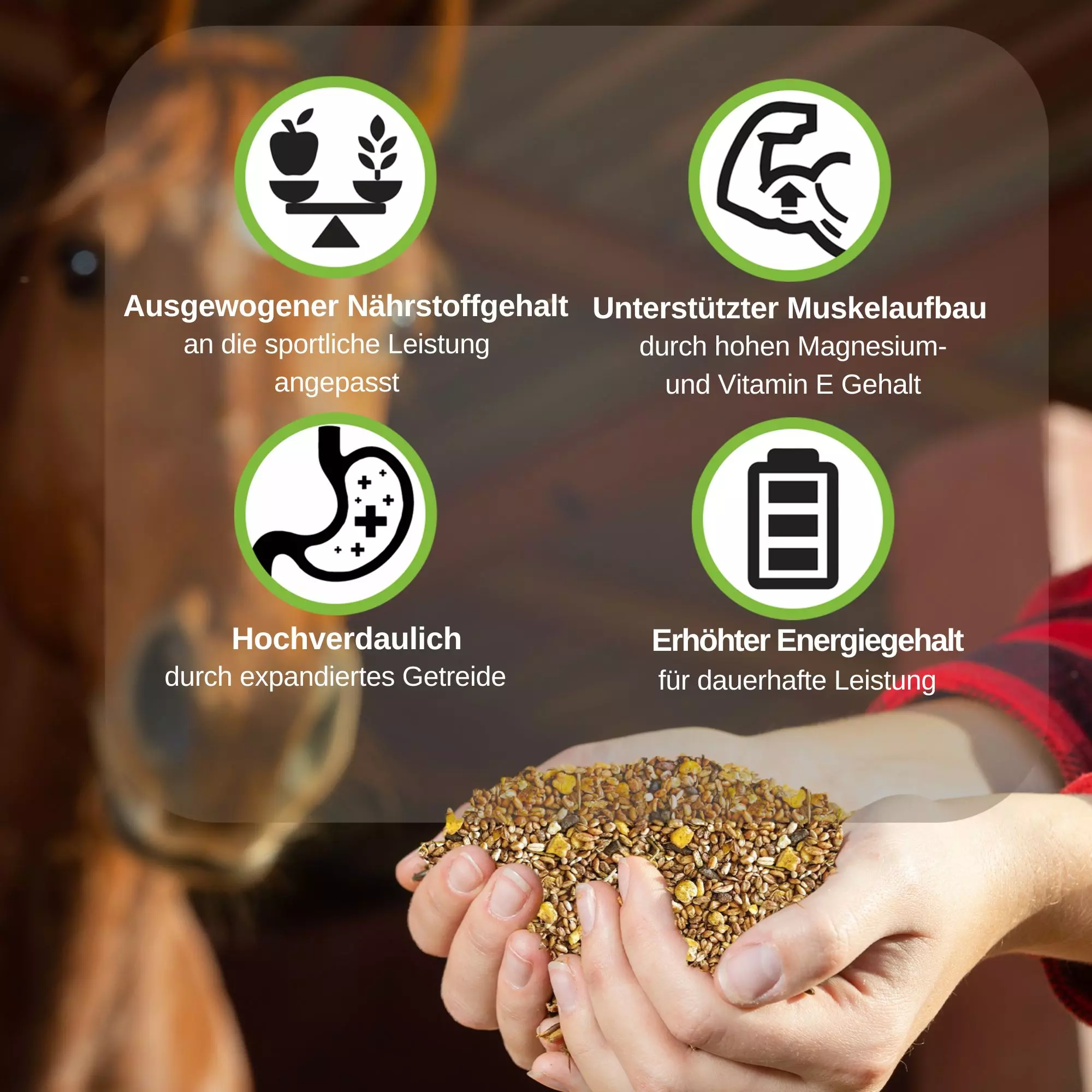 Als hochverdauliches Müsli empfiehlt sich dieses ausgewogene, haferfreie Futter besonders für den Einsatz bei stark beanspruchten Pferden