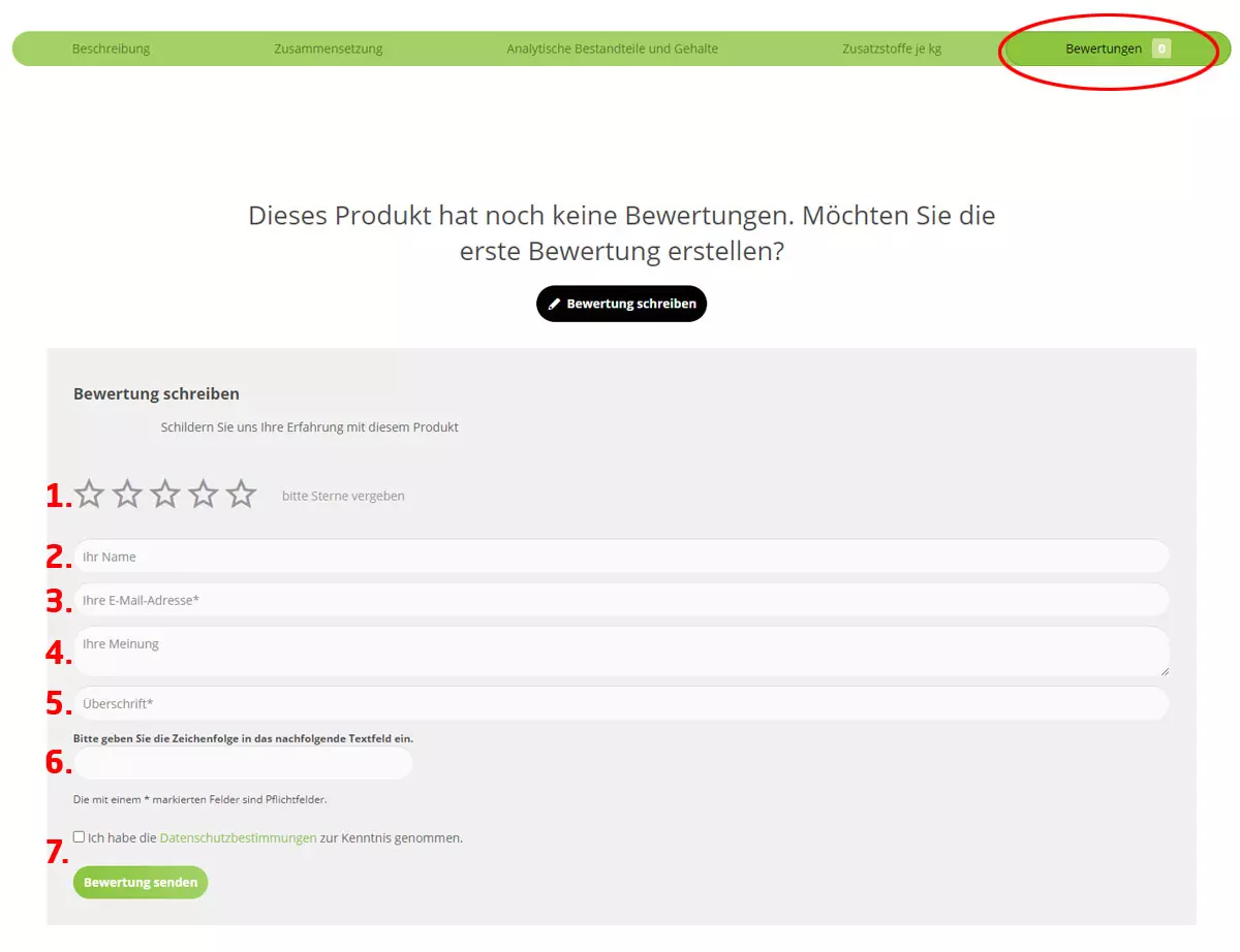 Unterhalb der Produktdarstellung auf den Produktdetailseiten finden Sie eine grüne Leiste mit unterschiedlichen Reitern. Unter dem Punkt „Bewertungen“ öffnet sich mit einem Klick bzw. Tipp auf das Feld „Bewertung schreiben“ ein Formularfeld.