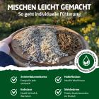 ,,"Unser volaris Selbst Mix Bundle ist für die ganzjährige Fütterung geeignet! Mischen Sie die Zutaten ganz nach Wunsch und Jahreszeit und streuen Sie das Futter an einer geschützten Stelle aus oder bieten Sie es in einem geeigneten Futterspender an. Wenn Sie das Futter in Vogelhäusern oder Futterspendern anbieten, reinigen Sie diese regelmäßig mit heißem Wasser. Auf diese Weise minimieren Sie die Übertragung und Ausbreitung von Krankheitserregern. Achten Sie darauf, dass das Futter auch bei starkem Wind, Schnee und Regen nicht durchnässt werden kann, da es sonst verdirbt oder vereist und die Vögel es dann nicht mehr fressen.