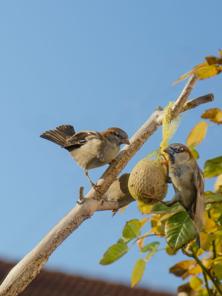 | Sperlinge Gehen gerne ans Futterhaus / Futterspender | Haussperling / Spatz Feldsperling | Sonnenblumenkerne Erdnüsse Getreideflocken |